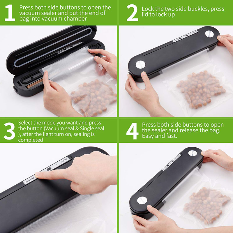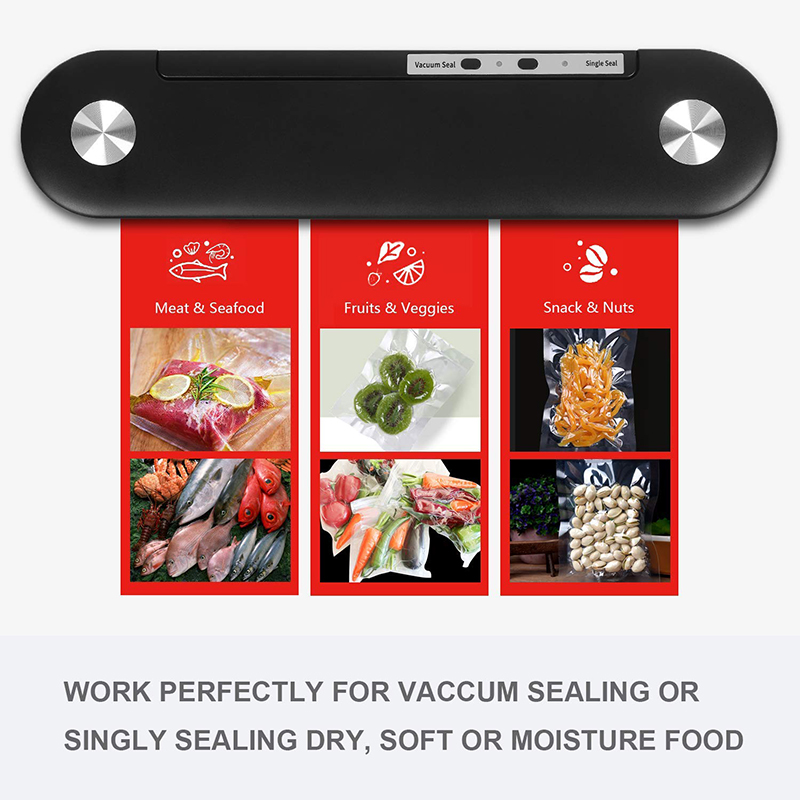 Food Vacuum Sealer quickly removes air from heat-seal bags to reduces spoilage and food waste,